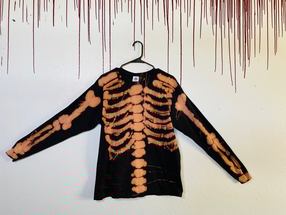 This is a preorder on a bleached skeleton long sleeve tee in black. The ones in the pictures are an example of how they look, each one is hand painted and are all unique!!